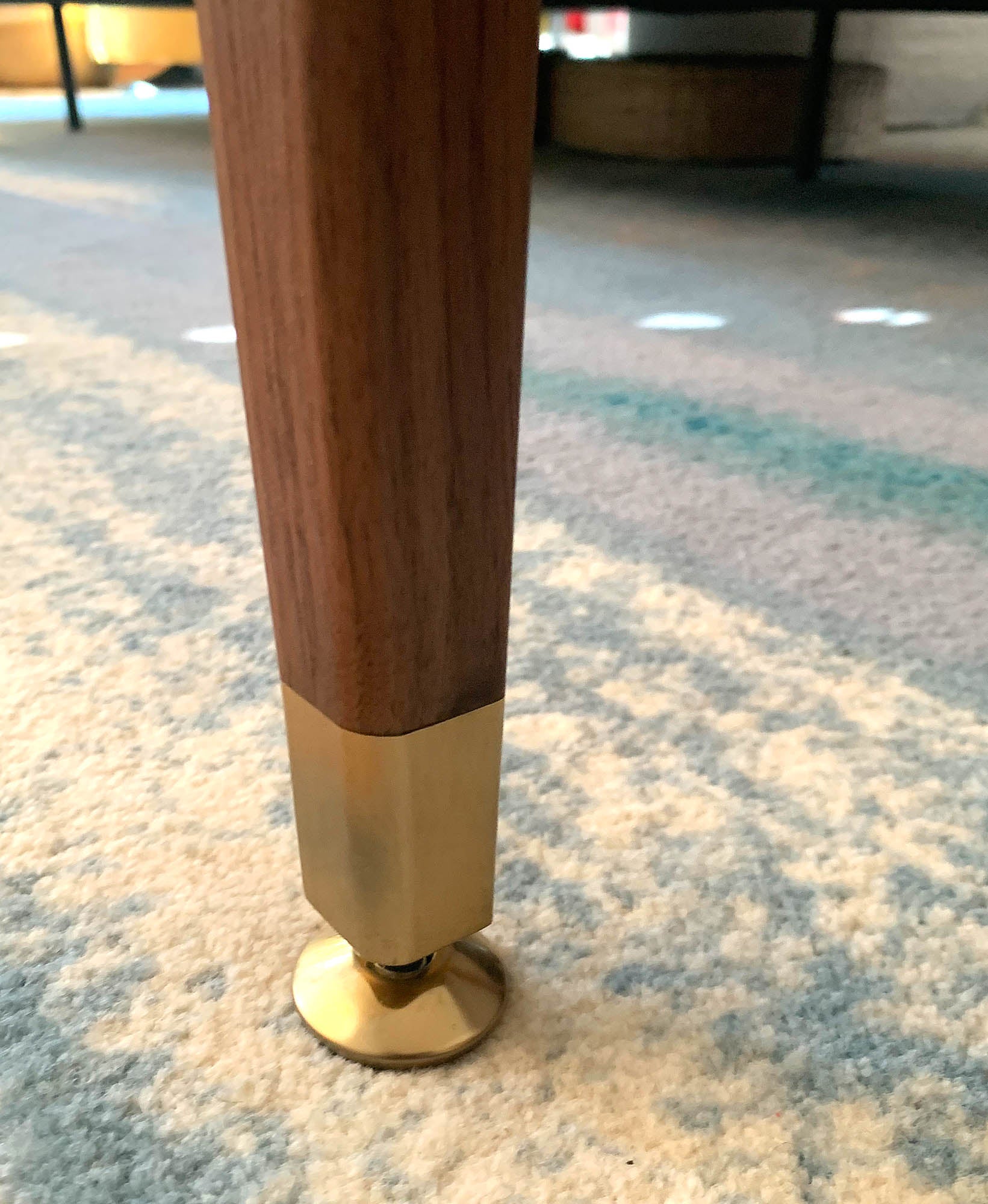 The legs are tapered on two sides and are capped with solid hand-shaped brass feet and levelers.