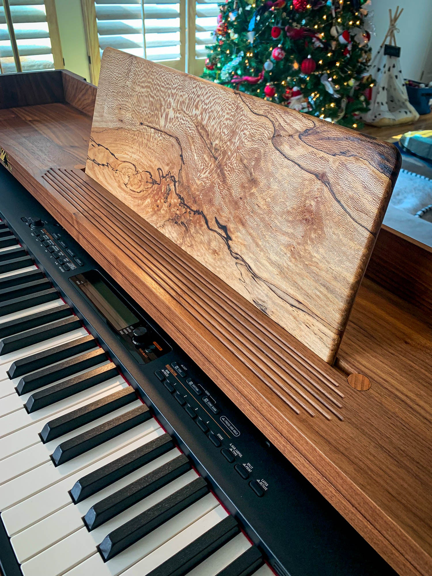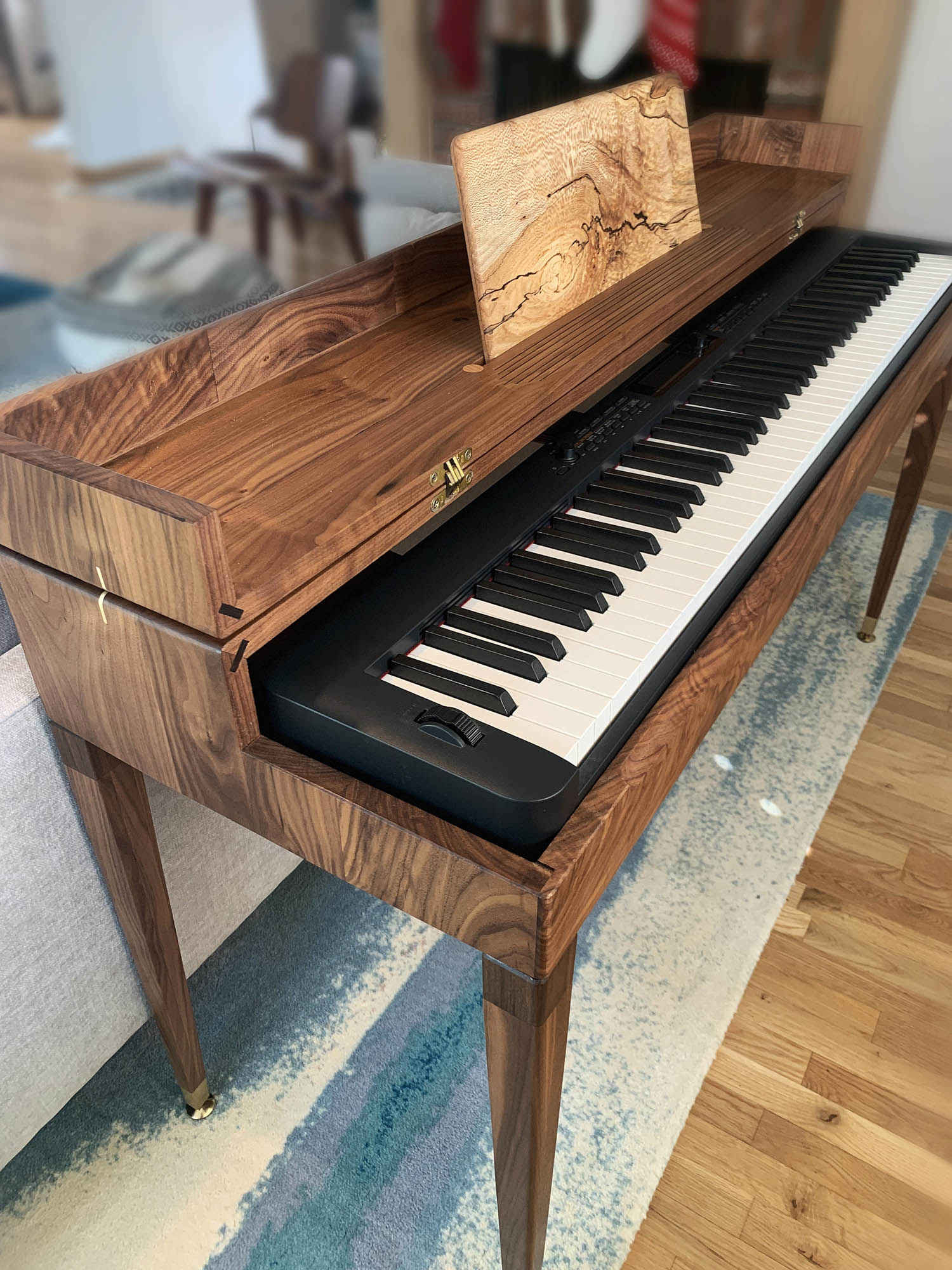 The lid utilizes SOSS hidden hinges which allow for an unobstructed flat top when closed. This allows the Anima to double as a quality writing desk or console table. When the lid is open a unique sheet music support panel presents itself. The panel attaches flat to the lid via brass thumb screws for storage and slides into an angled groove when in use. The support panel provides the opportunity to present a unique slice of timber or veneer, in this piece the support panel is made from a beautiful slice of Spalted Quarter Sawn Sycamore.