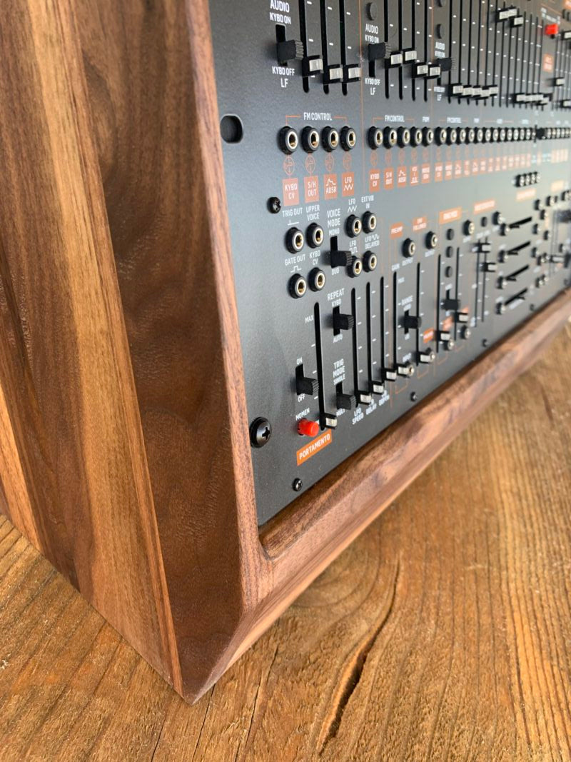 The cabinet features mid century mod lines and the synth is framed by a bevel inset on the front face.