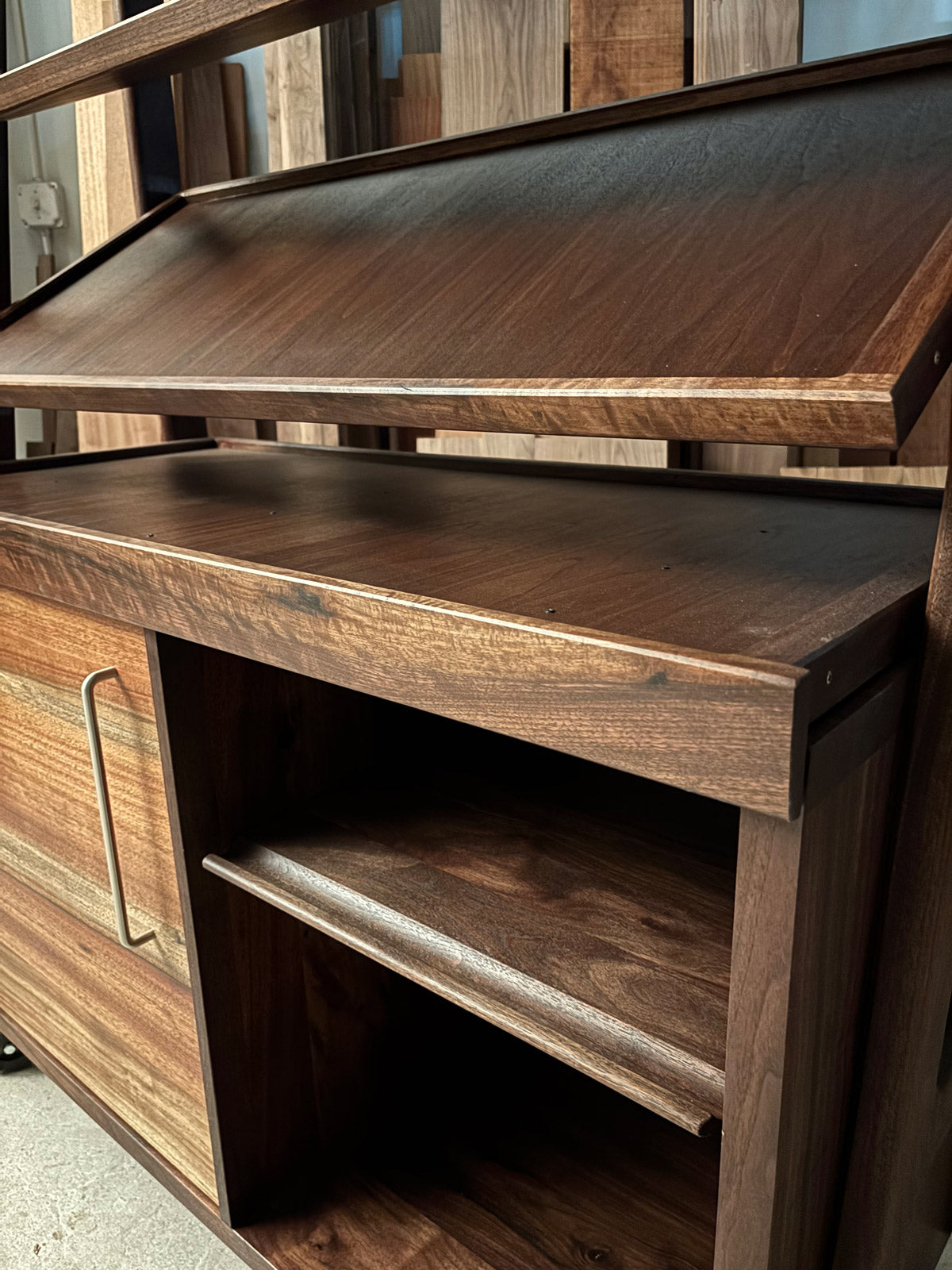 The Somnium Cabinet is a commissioned, vertical system designed to support keyboards, sound, and the evolving tools of a working studio. Rather than spreading outward, Somnium builds upward — creating a focused environment where instruments and systems live together with intention.